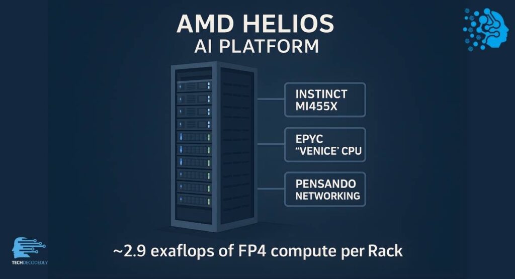 Figure: AMD’s data center innovation – AI racks like the “Helios” architecture will bring ~2.9 exaflops of FP4 compute per rack. AMD’s AI moves are not limited to Wall Street. On the infrastructure front, AMD is collaborating with partners worldwide to build next-generation AI supercomputers. For example, AMD and Hewlett Packard Enterprise (HPE) have unveiled the “Helios” rack‐scale AI platform. Helios pairs AMD Instinct MI455X accelerators with next-gen EPYC (“Venice”) CPUs and Pensando networking, delivering roughly 2.9 exaflops of FP4 AI performance per rack. Built on an open‐standard (OCP) design, Helios targets cloud providers and data centers, promising faster deployments and scale-out AI capacity.