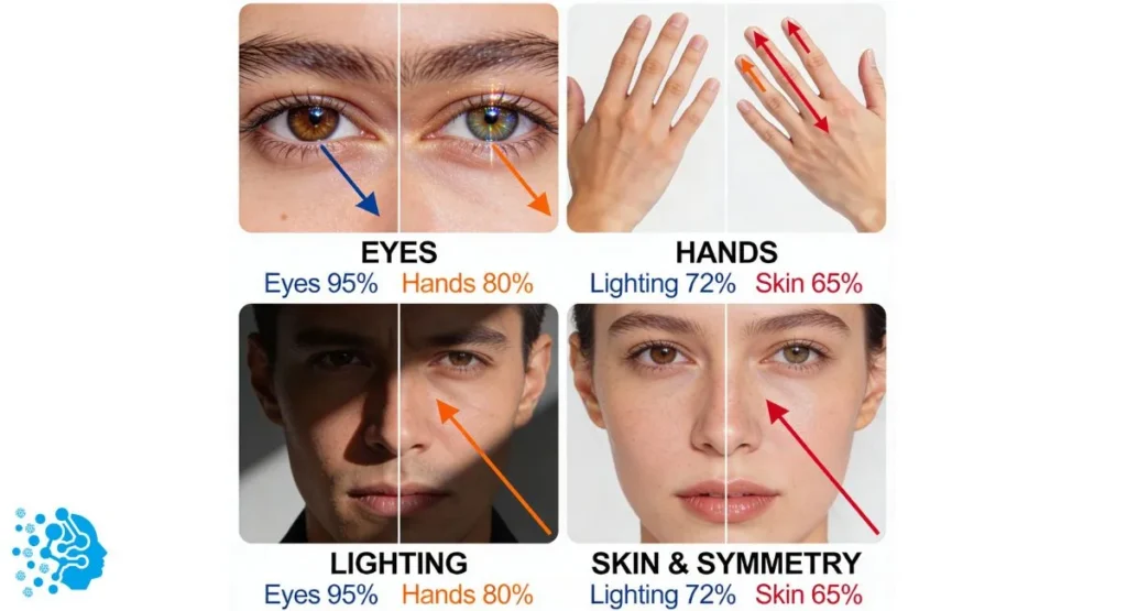 Lighting inconsistencies expose fakes. Real photos have uniform shadows; AI might mix sources oddly. A 2025 University of Leeds study found that eye reflections often do not match the environment.