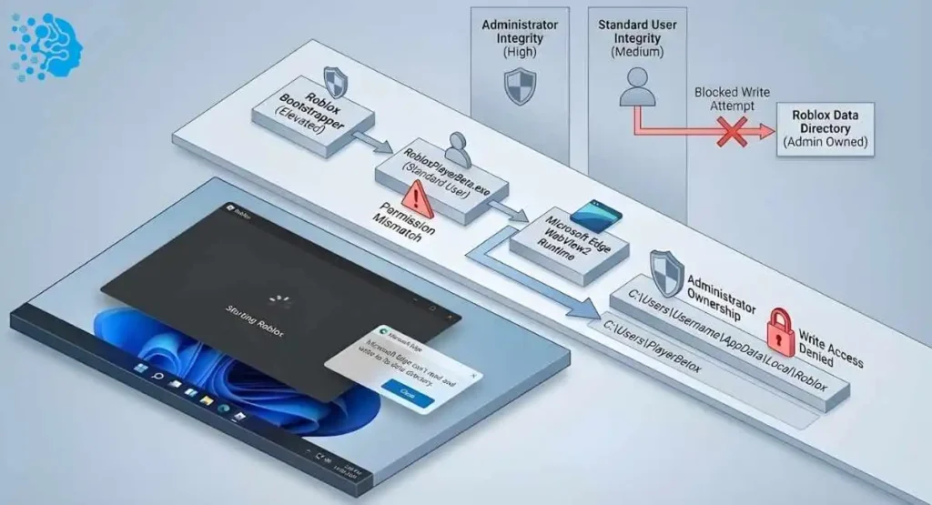 - The Consequence: The Bootstrapper creates a WebView2 data folder in %AppData%\Local\Roblox owned by “Administrators.”